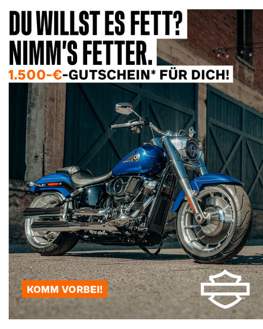 * Das Angebot gilt in Deutschland und Österreich und nur bis 31.10.2025. Beim Kauf eines aktuellen Harley-Davidson® Cruisers aus der aktuellen 2025er Harley-Davidson® Cruiser Modellpalette erhältst Du in Deutschland und Österreich einen Gutschein im Wert von 1.500 € für Harley-Davidson® Motorradbekleidung, Parts & Accessories. Der Gutschein ist nicht übertragbar, nicht erstattungsfähig und kann nicht in Bargeld ausgezahlt werden. Er ist nur bei teilnehmenden Harley-Davidson® Vertragshändlern einlösbar. Ein nicht genutztes Guthaben verfällt. Das Angebot kann nicht mit anderen Aktionen kombiniert werden und kann jederzeit zurückgezogen werden. Es gelten die örtlichen Geschäftsbedingungen.